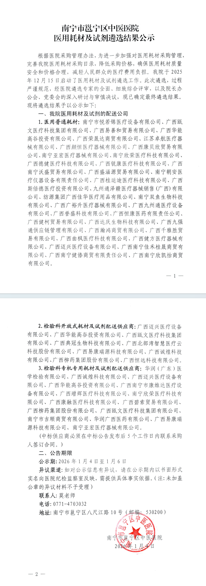 南宁市邕宁区中医医院医用耗材及试剂遴选结果公示