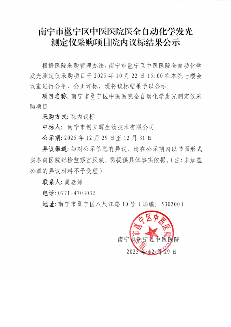 南宁市邕宁区中医医院医全自动化学发光测定仪采购项目院内议标结果公示